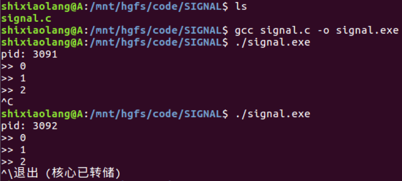 不含signal 函数的一个进程, 使用Ctrl + C 或者 Ctrl + \ 可以结束当前进程