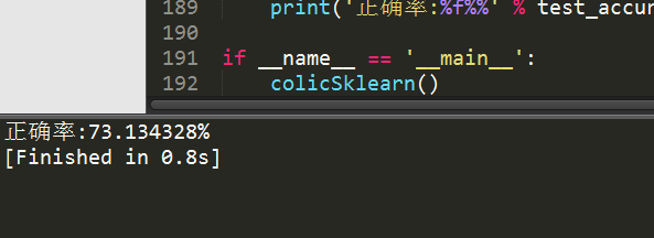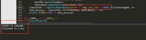 frTrain = open('horseColicTraining.txt')#打开训练集 frTest = open('horseColicTest.txt')#打开测试集 trainingSet = []; trainingLabels = [] testSet = []; testLabels = [] for line in frTrain.readlines(): currLine = line.strip().split('\t') lineArr = [] for i in range(len(currLine)-1): lineArr.append(float(currLine[i])) trainingSet.append(lineArr) trainingLabels.append(float(currLine[-1])) for line in frTest.readlines(): currLine = line.strip().split('\t') lineArr =[] for i in range(len(currLine)-1): lineArr.append(float(currLine[i])) testSet.append(lineArr) testLabels.append(float(currLine[-1])) classifier = LogisticRegression