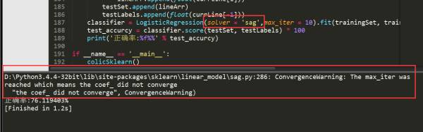 可以看到,正确率又高一些了。更改solver参数,比如设置为sag,使用随机平均梯度下降算法,看一看效果。你会发现,有警告了。