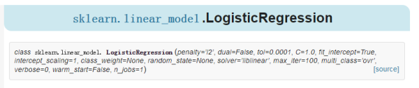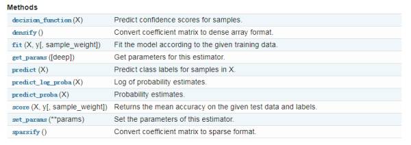 对于每个函数的具体使用,可以看下官方文档:http://scikit-learn.org/dev/modules/generated/sklearn.linear_model.LogisticRegression.html#sklearn.linear_model.LogisticRegression