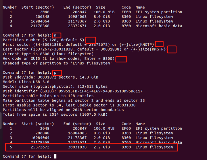 创建ISO分区,大小剩余的,分区号5,分区类型代码 8300,按n后一路回车全部默认。