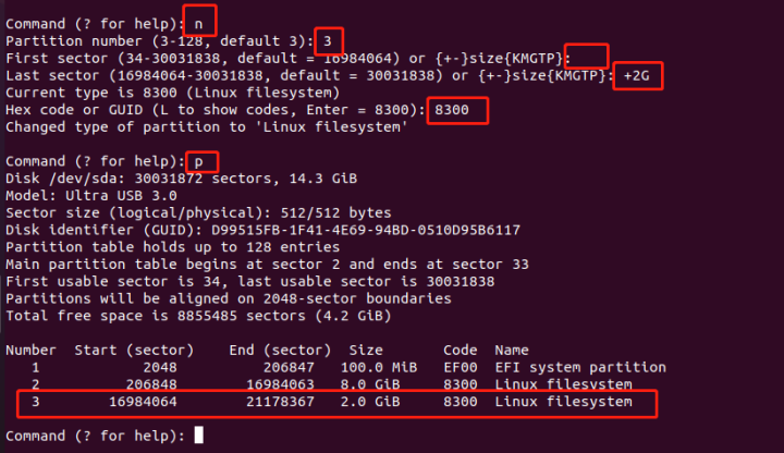 创建home分区,大小2G,分区号3,分区类型代码 8300