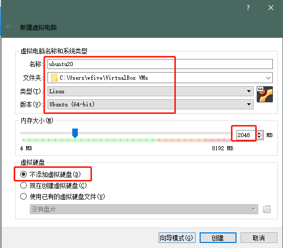 内存建议2G以上,注意选择不添加虚拟硬盘,我是要安装到U盘上的,键入完成后选择创建。