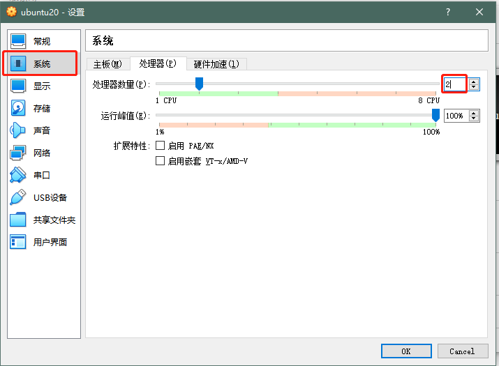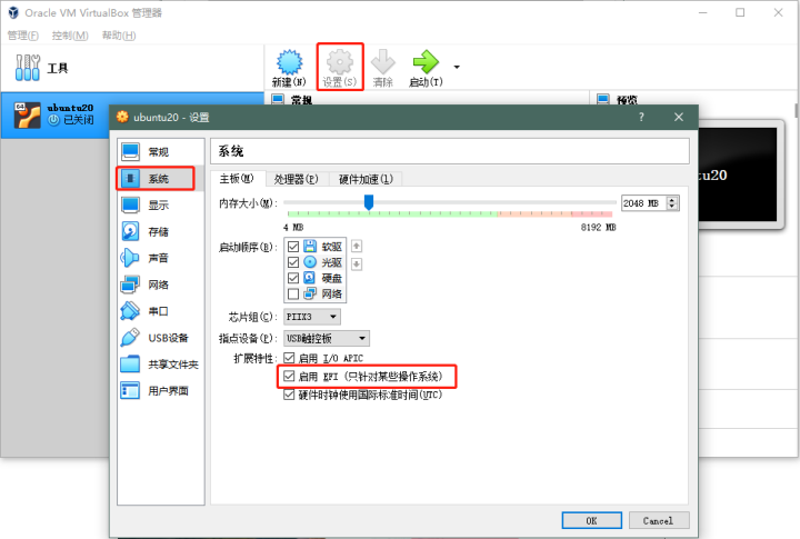 选中上面创建的ubuntu20,点击设置->系统,勾选 “启动EFI(只针对某些操作系统)”不要慌,某些操作系统就是指我们即将安装的操作系统?,设置完别急着OK,下面多有都设置完了再点击OK。