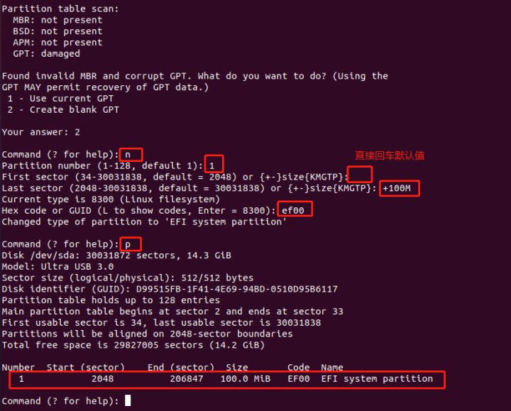 由于我U盘本身有一个GPT分区表,GPT分区表会在数据块末尾备份一份,前面我们只是擦出了U盘头部数据,所以gdisk工具打开U盘还是会识别到数据尾的备份GPT分区表,提示是否使用当前分区表还是新建一个空分区表,这里输入2新建一个空分区表。