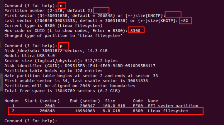 创建root分区,大小8G,分区号2,分区类型代码 8300