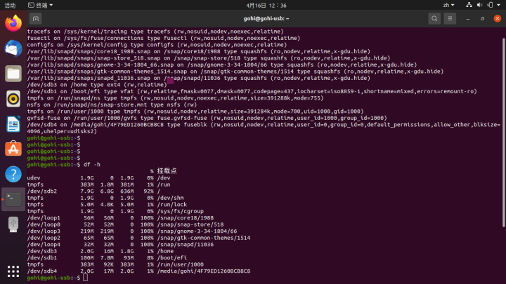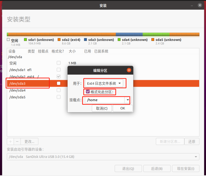 / /boot/efi 和 /home均挂载在U盘上,/也已经接近满了,所以U盘建议大一些。