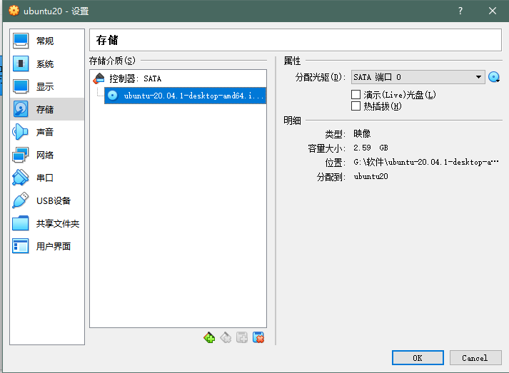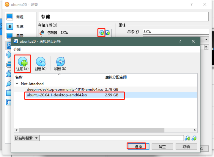 选中“控制器:SATA“点击图示小图标,弹出窗口点击注册,选择我们的Ubuntu20 ISO镜像,注册完选中并点击选择: