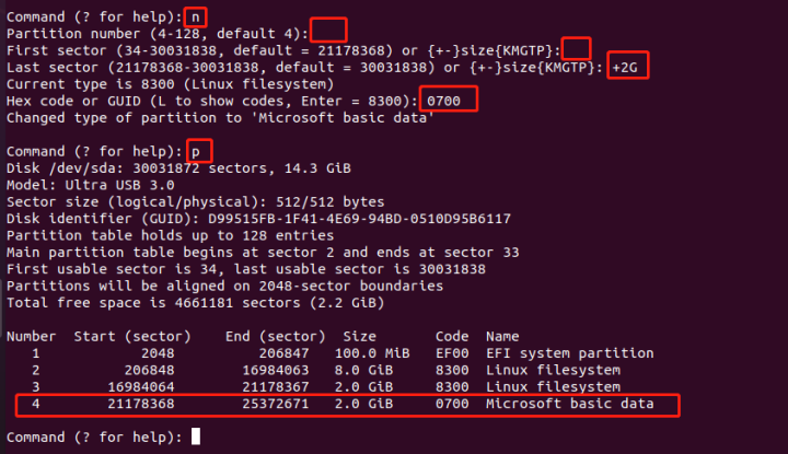 创建windows分区,大小2G,分区号4,分区类型代码 0700