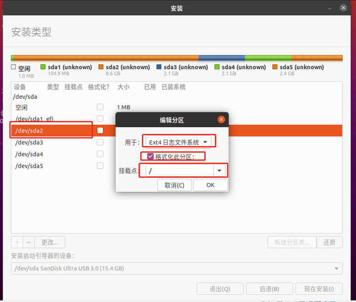 选中分区2,右键->更改,选择ETX4文件系统,勾选格式化,挂载点为 /