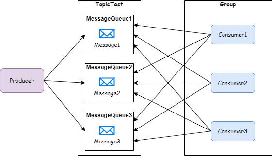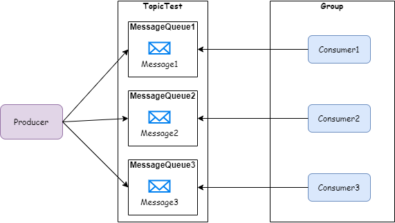 集群模式是指 RocketMQ 中的一条消息只能被同一个消费者组中的一个消费者消费。如下图,Producer 向 TopicTest 这个 Topic 并发写入 3 条新消息,分别被分配到了 MessageQueue1~MessageQueue3 这 3 个队列,然后 Group 中的三个 Consumer 分别消费了一条消息: