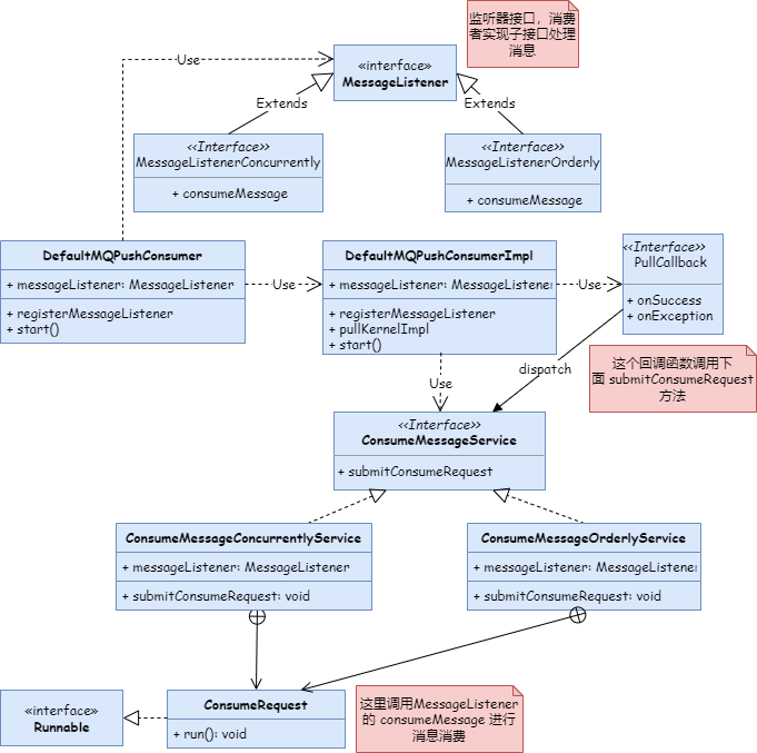 以 RocketMQ 推模式为例,看一下消费者调用关系类图: