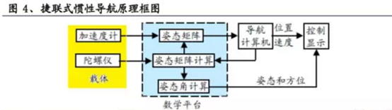 - 捷联式惯导:即将惯性测量装置(加速度计和陀螺仪)直接装在飞行器、舰艇、导弹等载体上,捷联式基于数学平台,与载体直接相连,易于安装、维修和更换,且体积小,缺陷是惯性测量装置与载体相连导致其工作环境恶化,测量精度下降。