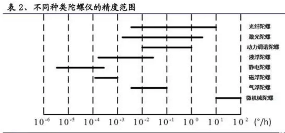 根据其精度范围大致分为超高精度陀螺仪、中高精度陀螺仪和低精度陀螺 仪。超高精度陀螺仪指精度范围在 10-6 o/h~5*10-4 o/h 范围内的陀螺仪,主要包括液浮陀螺、静电陀螺等,目前最高精度的陀螺仪是静电陀螺仪。中高精度陀螺 仪指精度在 5*10-4 o/h~10-1 o/h 的陀螺仪,目前最有发展前景的陀螺仪是光学陀螺仪,激光陀螺属于第一代光学陀螺,光纤陀螺属于第二代光学陀螺,最近几年 ,由于光纤陀螺在精度、性能和尺寸上具有更大的潜力,越来越受到各国军方的 青睐。低精度陀螺仪是指精度范围超过 10-1 o/h 的陀螺仪,目前发展前景较好的是MEMS 陀螺仪,虽然精度低,但低廉的价格使其具有广阔的应用前景