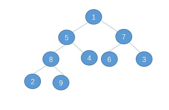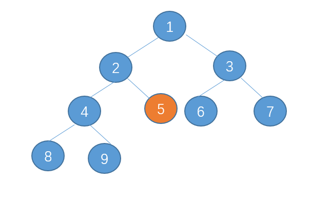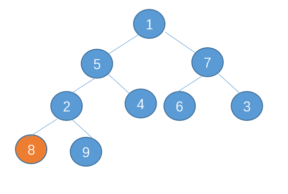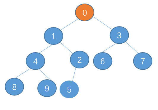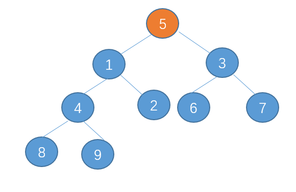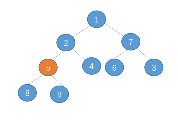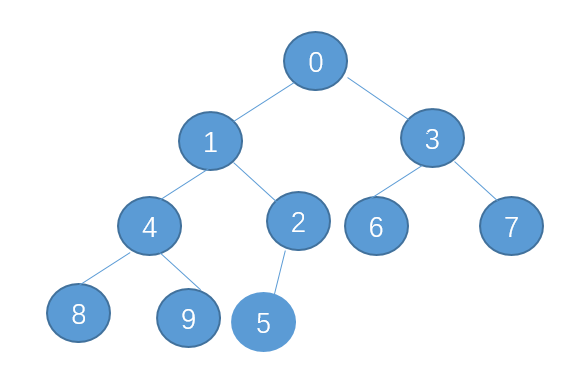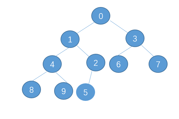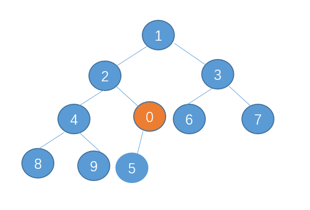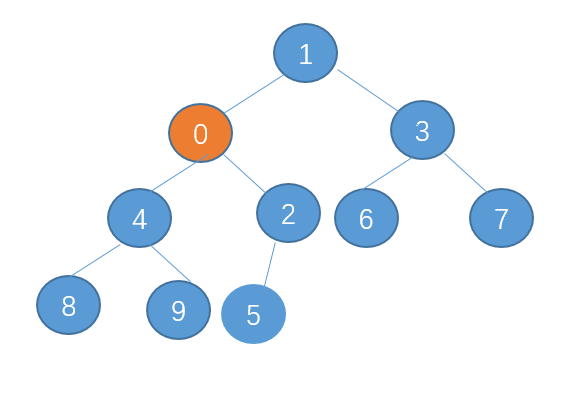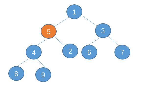 之后再来调整,调整的规则和插入差不多类似,采取下沉的策略:让5和左右孩子节点相比较,如果左右节点有小于5的,则让那个较小的孩子代替5的位置,然后5下沉。