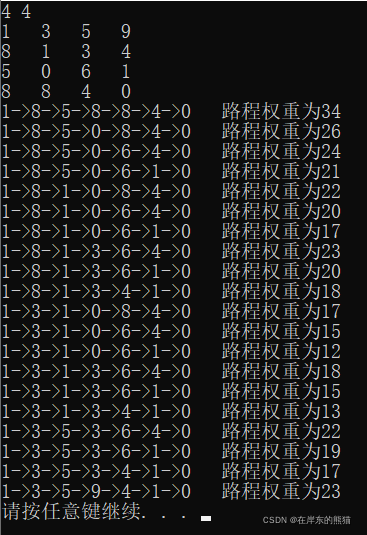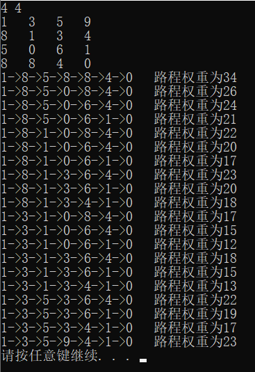 printf("%d 路程权重为%d\n",Both[i].road[j],Both[i].total);