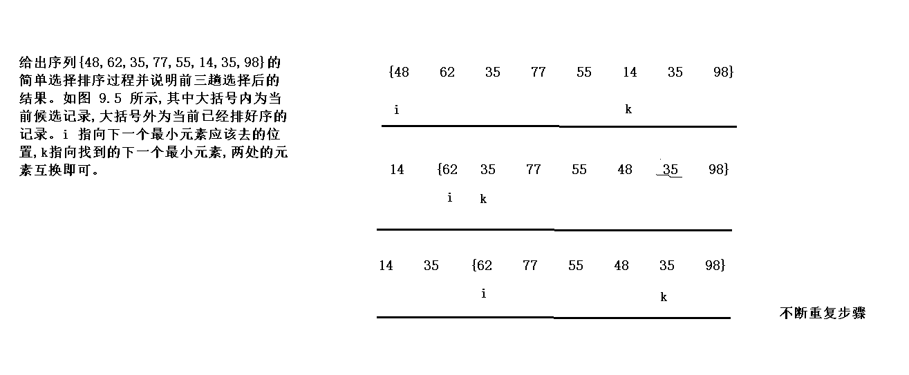 第 i 趟简单选择排序时,从第 i 个记录开始,通过 n-i 次关键字的比较,从 n-i+1 个记录中选出关键字最小的记录,并和第i个记录进行交换。