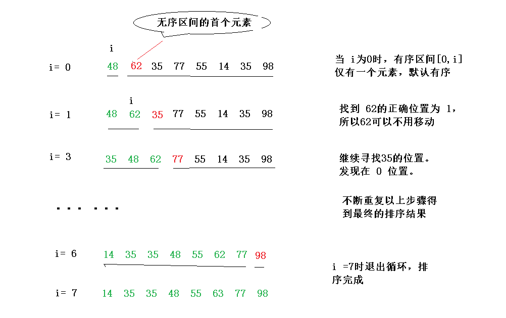 整个区间被分为:1. 有序区间;2. 无序区间;每次选择无序区间的第一个元素,在有序区间内选择合适的位置插入。