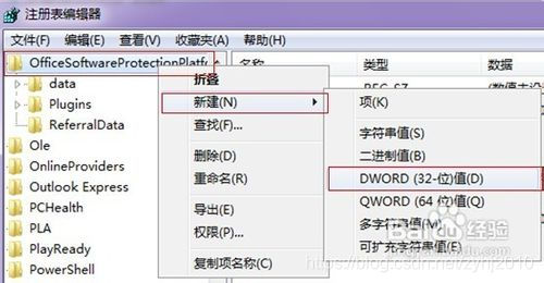 按“win+R”,打开运行,输入“regedit”,确定即可打开注册表编辑器。依次打开HKEY_LOCAL_MACHINE\SOFTWARE\Microsoft\OfficeSoftwareProtectionPlatform,右键-新建-DWORD(32-位)值(D),命名为“InactivityShutdownDelay”(不包括引号)。如下图所示