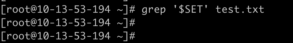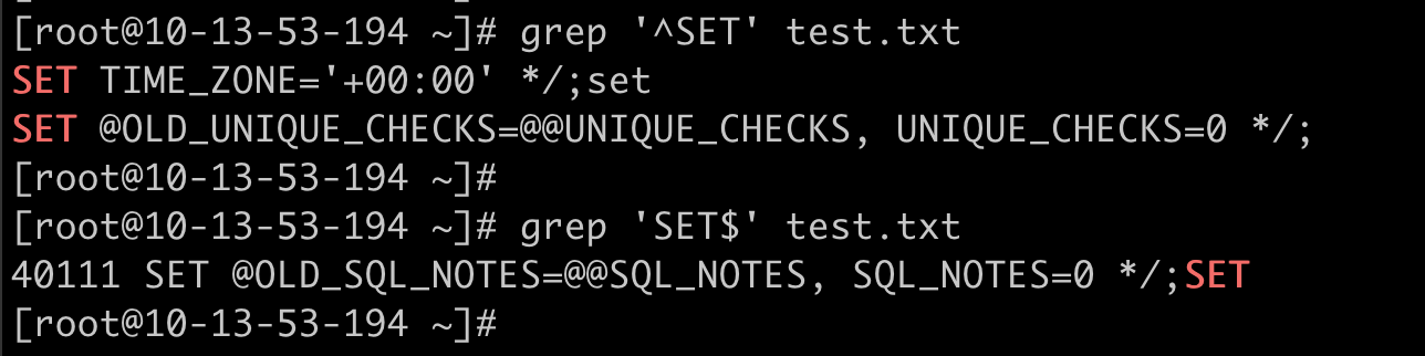 这时候只输出SET在行首和行尾的结果了,注意匹配行首^符号是在关键字的前面的, 匹配行尾$符号是在关键字后面的,如果$放在关键字前面,则得不到正确的结果: