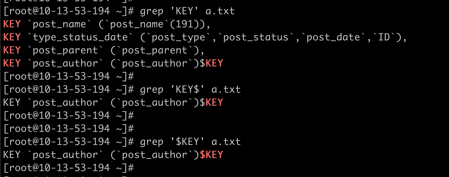 第一个的匹配文件中的所有KEY,第二个是匹配文件中以KEY结尾的所有行,第三是匹配文件中$KEY的行