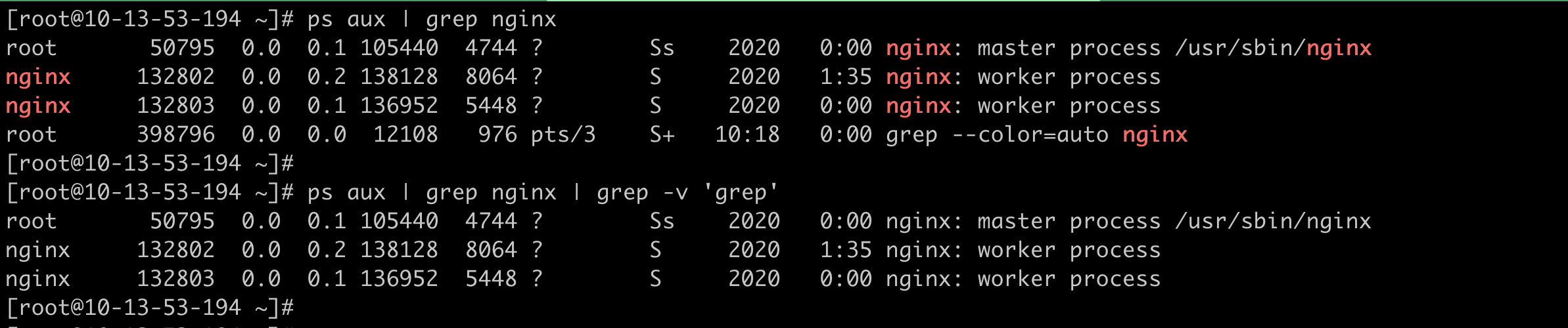 后面一个命令加了grep -v 'grep',就不显示grep命令本身了