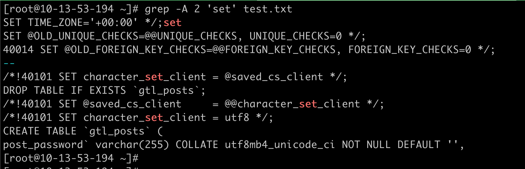 -A 2 ,是指定显示匹配了set之后,匹配行后面的2行也输出