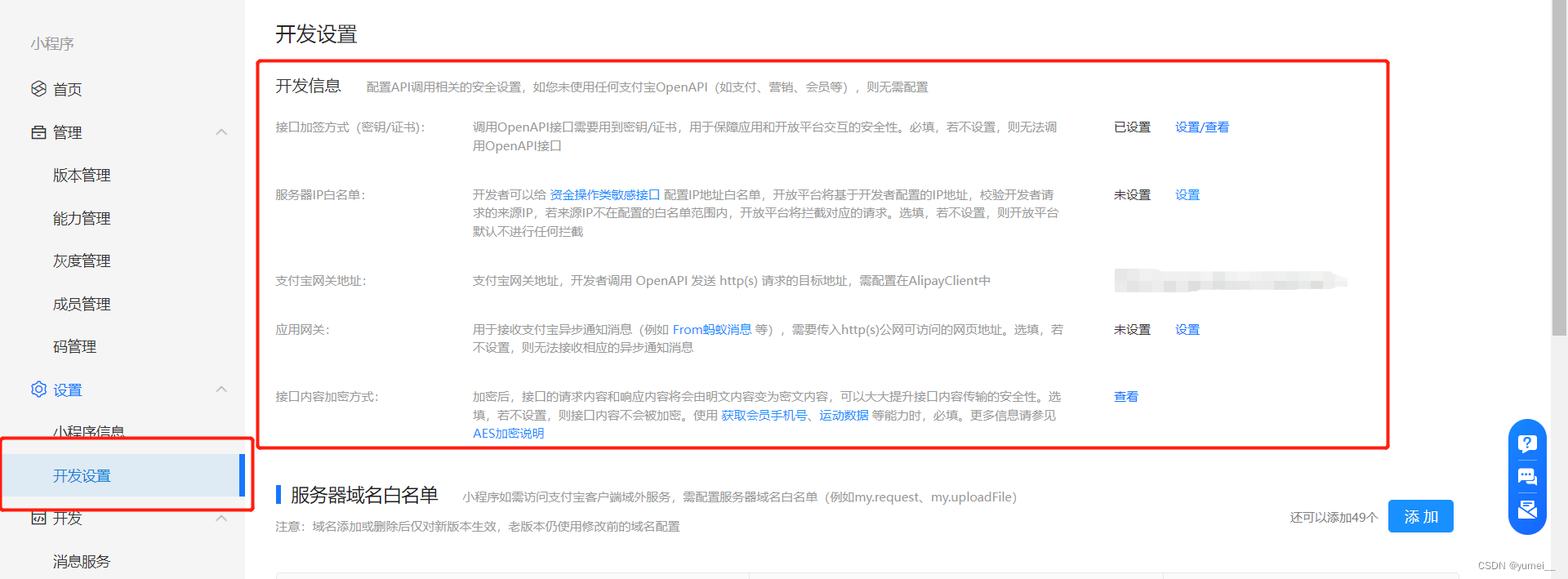 1.首先在小程序开发设置中配置接口加签方式和接口内容加密方式,应用网关和IP白名单,
