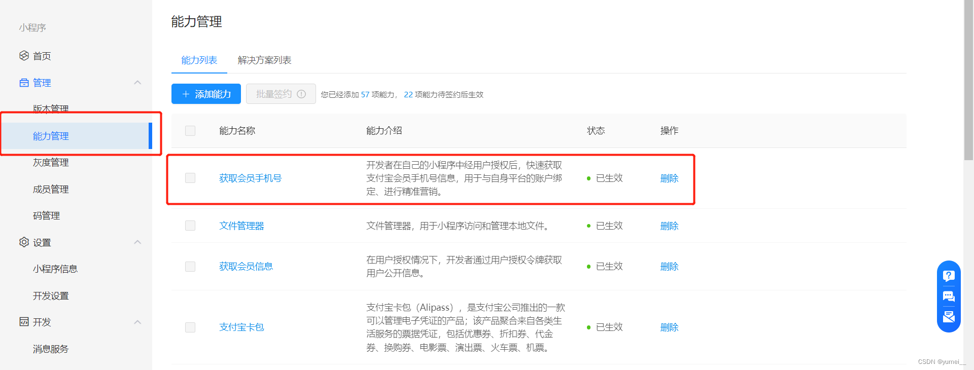 配置成功后在小程序中调用授权获取手机号,授权成功会返回一串加密的字符,需要后端进行解密,字符传给后端,后端在解密的过程中可能会碰到 “ISV权限不足” 这种情况,碰到这种情况有可能是由于未添加“获取会员手机号”功能包或未 申请用户信息 。在小程序开发管理后台 的功能列表中,点击添加功能,添加 获取会员手机号 功能包。点击 用户信息申请。在 申请权限 中申请用户手机号。(子账号不能用户信息申请,需要主账号进行申请,无图)