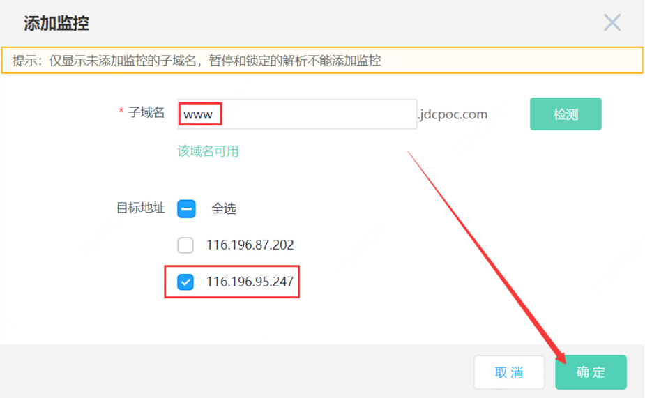 我们要监控云主机dns_test1,所以选择对应的公网IP即可