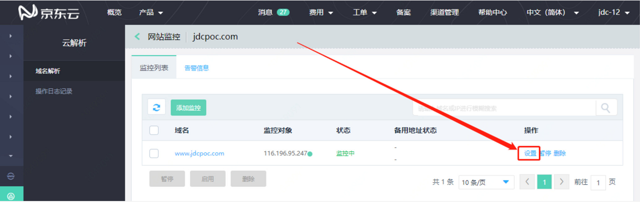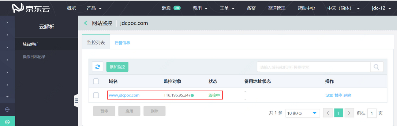 云解析是在域名解析的基础上,由京东云团队,结合京东云的优质网络、主机资源研发的高可用、高可靠、功能丰富的权威DNS服务器。云解析拥有简单易用的控制台,方便用户对域名进行操作。采用多集群、多节点部署,拥有百G防护套餐,专业DNS团队提供全面的服务保障能力。本次操作需要用到京东云云解析【企业高级版】¥3888/年,因为只有这个版本才有网站监控功能