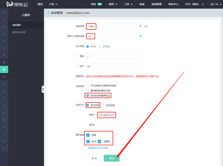 如下图,切换规则选择强制暂停该解析记录,切换方式选择自动切回,通知策略选择短信、邮件、消息栏(消息栏就是控制台顶部导航的消息)