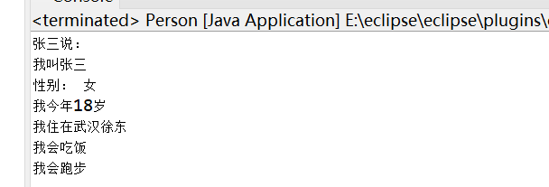 }要注意,到此为止,虽然类已经比较完善了,但自始至终并未产生一个能做事的对象来,我们只是把所有人的公共特点、行为通过类的形式归纳抽象出来。那么如何使用这个类,该如何通过这个类,产生一个具有姓名、年龄等属性,可以吃饭跑步的对象呢?