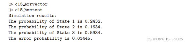 总结一下,c15_errvector.m 实现了对差错向量和状态序列向量的仿真,c15_hmmtest t.m 实现了对差错概率以及每种状态概率的计算,如图。