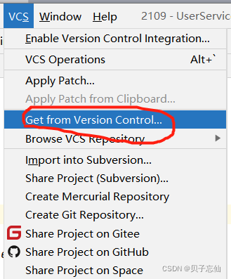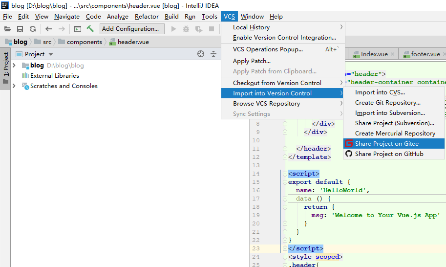 然后打开idea,点击顶部菜单VCS如下图,选择Import into Version Control,选择Share Project on Gitee