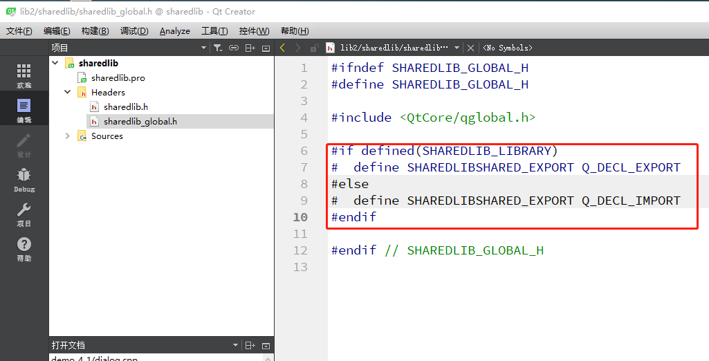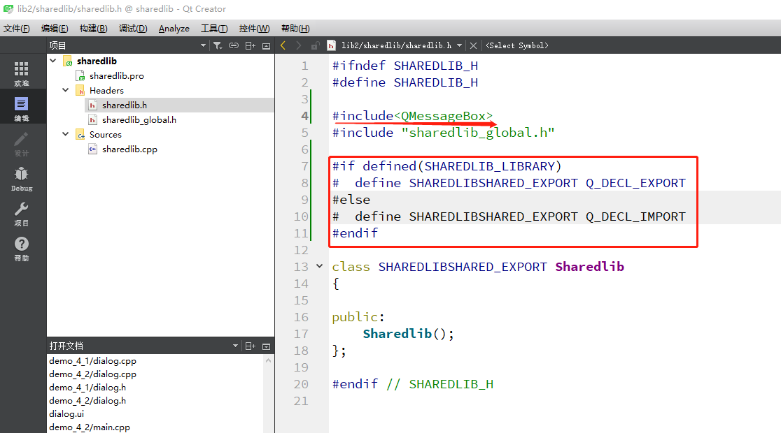 将sharedlib_global.h文件中 红框标注部分代码粘贴到 sharedlib.h文件中。经过测试发现不粘贴此部分代码程序也可以正常编译运行。