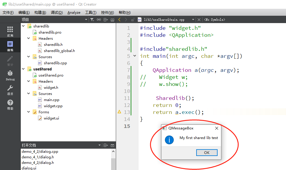 将 sharedlib 工程源码目录下的 sharedlib.h 和 sharedlib_global.h 头文件复制到 useShared工程源码目录下, 将 sharedlib.dll 文件复制到 useShared.exe 所在目录中
