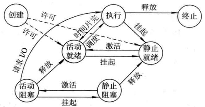 - 引入挂起操作后进程三个基本状态间的切换 (执行 就绪 阻塞)