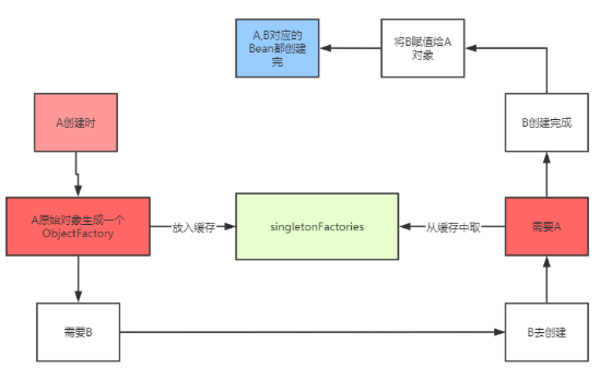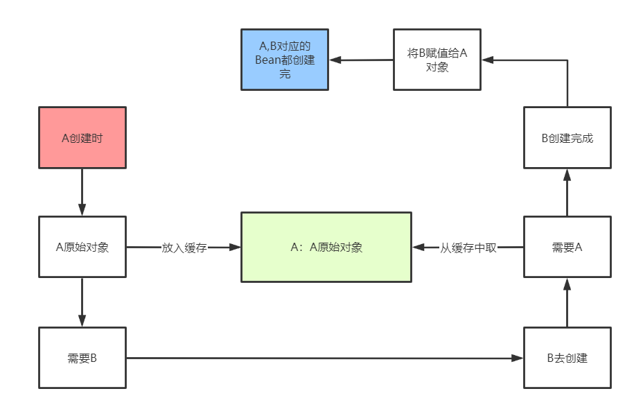 A的Bean在创建过程中,在进行依赖注入之前,先把A的原始Bean放入缓存(提早暴露,只要放到缓存了,其他Bean需要时就可以从缓存中拿了),放入缓存后,再进行依赖注入,此时A的Bean依赖了B的Bean,如果B的Bean不存在,则需要创建B的Bean,而创建B的Bean的过程和A一样,也是先创建一个B的原始对象,然后把B的原始对象提早暴露出来放入缓存中,然后在对B的原始对象进行依赖注入A,此时能从缓存中拿到A的原始对象(虽然是A的原始对象,还不是最终的Bean),B的原始对象依赖注入完了之后,B的生命周期结束,那么A的生命周期也能结束。