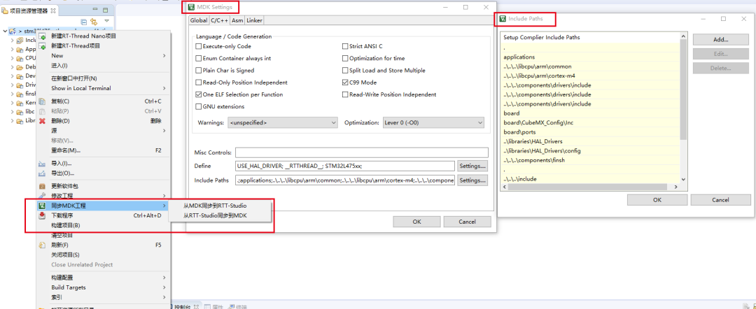 Studio 现在支持和 MDK 工程双向同步协同开发。大家可以将现有的 RT-Thread MDK 工程直接导入到 Studio 中,MDK 的配置会自动同步到 RT-Thread Studio 工程。Studio 提供了双向同步的机制,可以在 MDK 工程和 Studio 工程之间随时切换,并且提供了 MDK 的配置功能,可以执行 C/C++、 ASM、 Linker 等配置项,配置结束后,会自动同步到 MDK 工程。如果大家在 MDK 上修改了一些配置,也可以在 Studio 手动触发同步功能,会将修改后的配置同步到 Studio 工程。