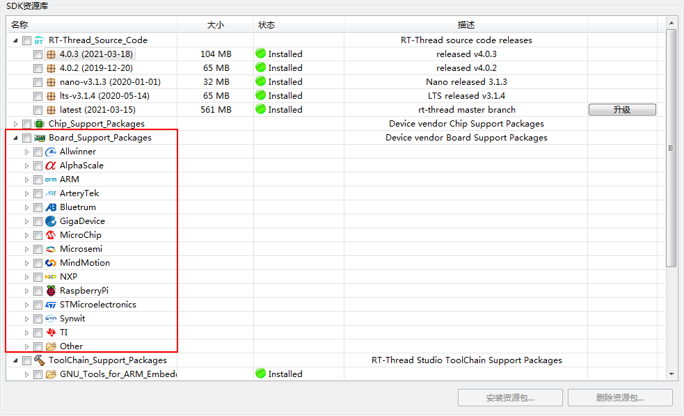 目前已通过Studio的开发板支持包制作功能,制作上线了40多个开发板支持包,目前开发板支持包总计70多个,涵盖了8个不同厂商,例如Allwinner,AlphaScale,ArteryTek,Bluetrum,GigaDevice,MicroChip,MindMotion,NXP,ST,TI,Synwit。特别值得提一下的是,本次新增上线了RT-Thread V4.0.3新版本源码资源包。