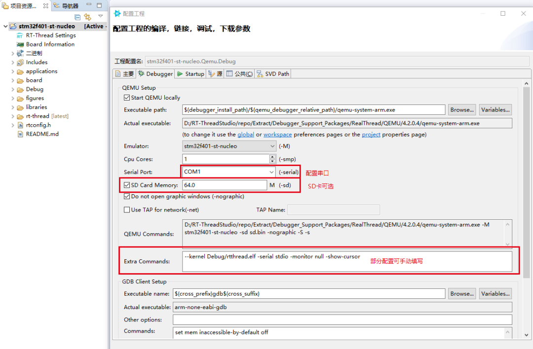 QEMU这次新增了两个模拟器:stm32f401 和 stm32f410 系列,大家可以在 SDK Manager 中下载最新版。配置 QEMU 时,在 Emulator 配置栏的下拉框中选择模拟器。另外,配置界面也做了一些更新,解决了一些用户反馈的问题。首先,新增了串口的配置,选择不同串口时,stdio 也会定位到对应的串口上;其次 SD Card Memory 改成了可选项,兼容不需要 SD 卡的情况;最重要的一点,将 -show-cursor 等命令移动到了 Extra Command 中,大家可以自定义这些命令的参数,让 QEMU 使用上更具灵活性。