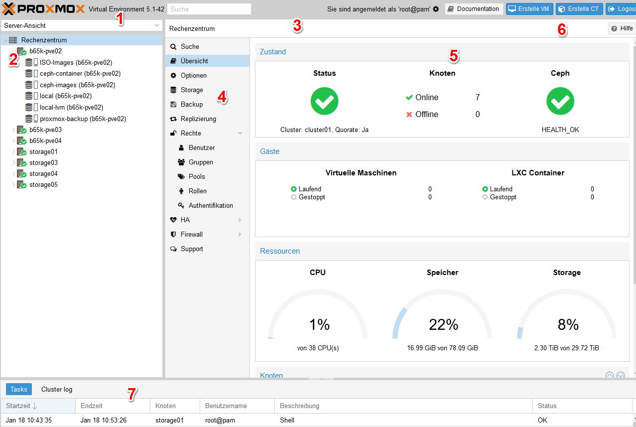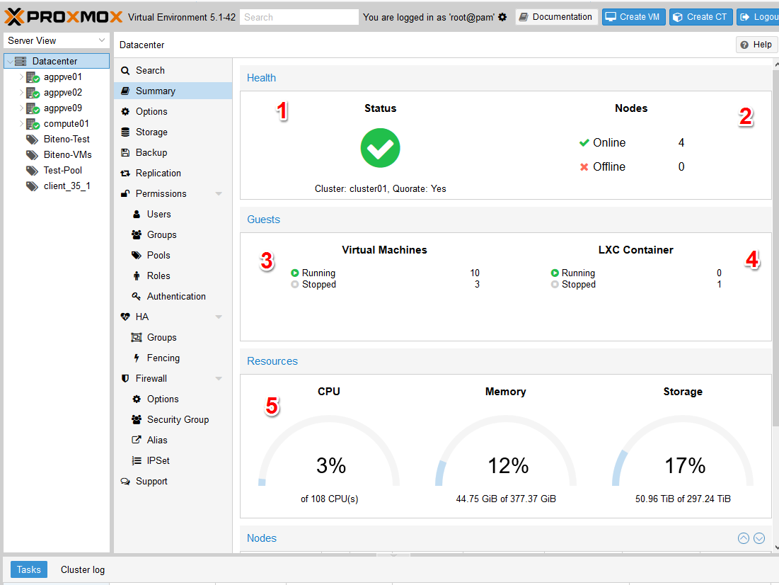 在所谓的数据中心或“数据中心”的标准概述中,您可以查看所有节点的状态以及整个集群的CPU,RAM(主内存)和存储利用率。