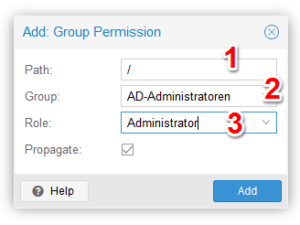 在最后一步,我们将管理权限分配给“ AD管理员”组。为此,请在(1)中输入路径“ /”。这样,AD管理员组就可以访问整个群集。