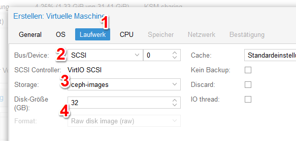 在已将计算机映像复制到的Proxmox主机上创建一个新的虚拟机。确保在Proxmox主机上将硬盘创建为“本地”硬盘。另请注意3位数的VM-ID。