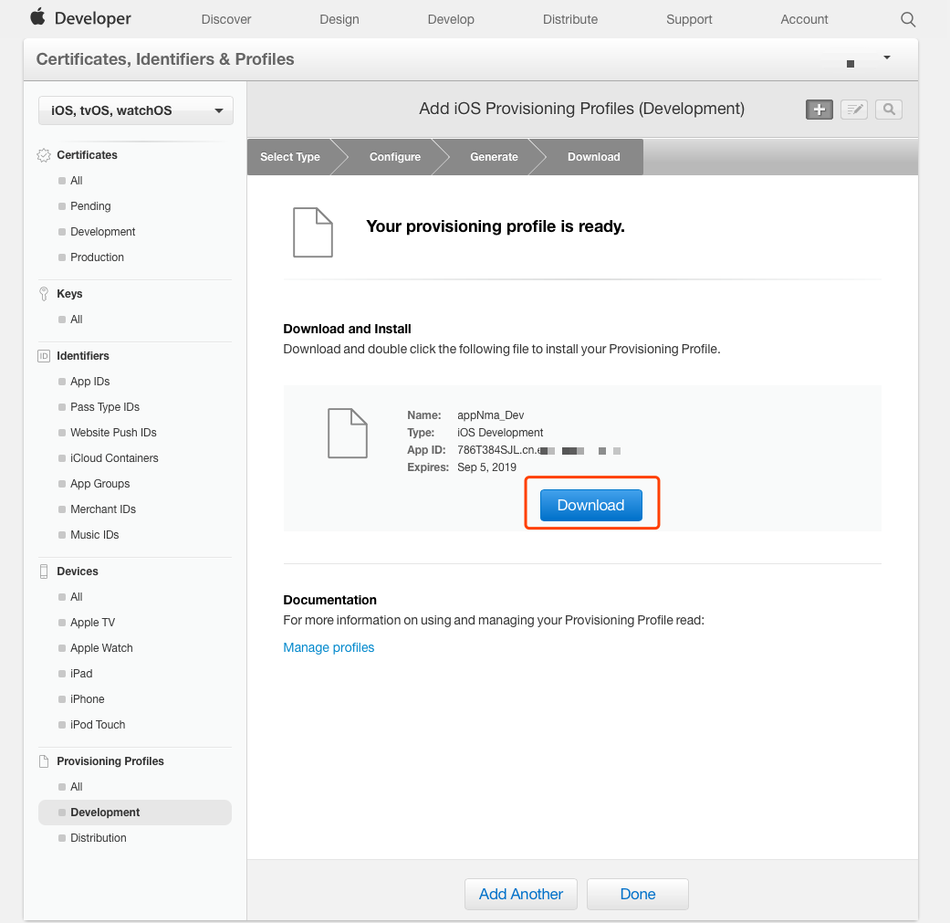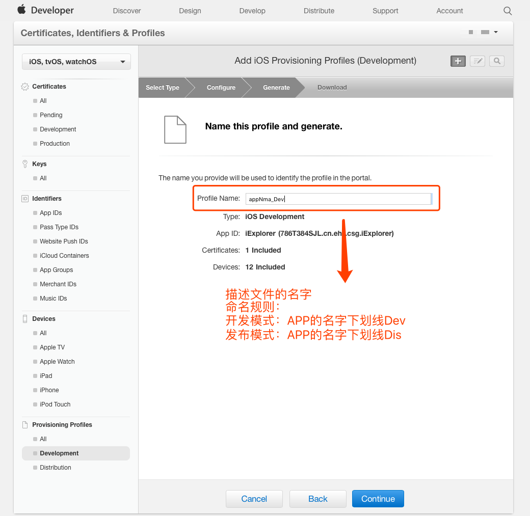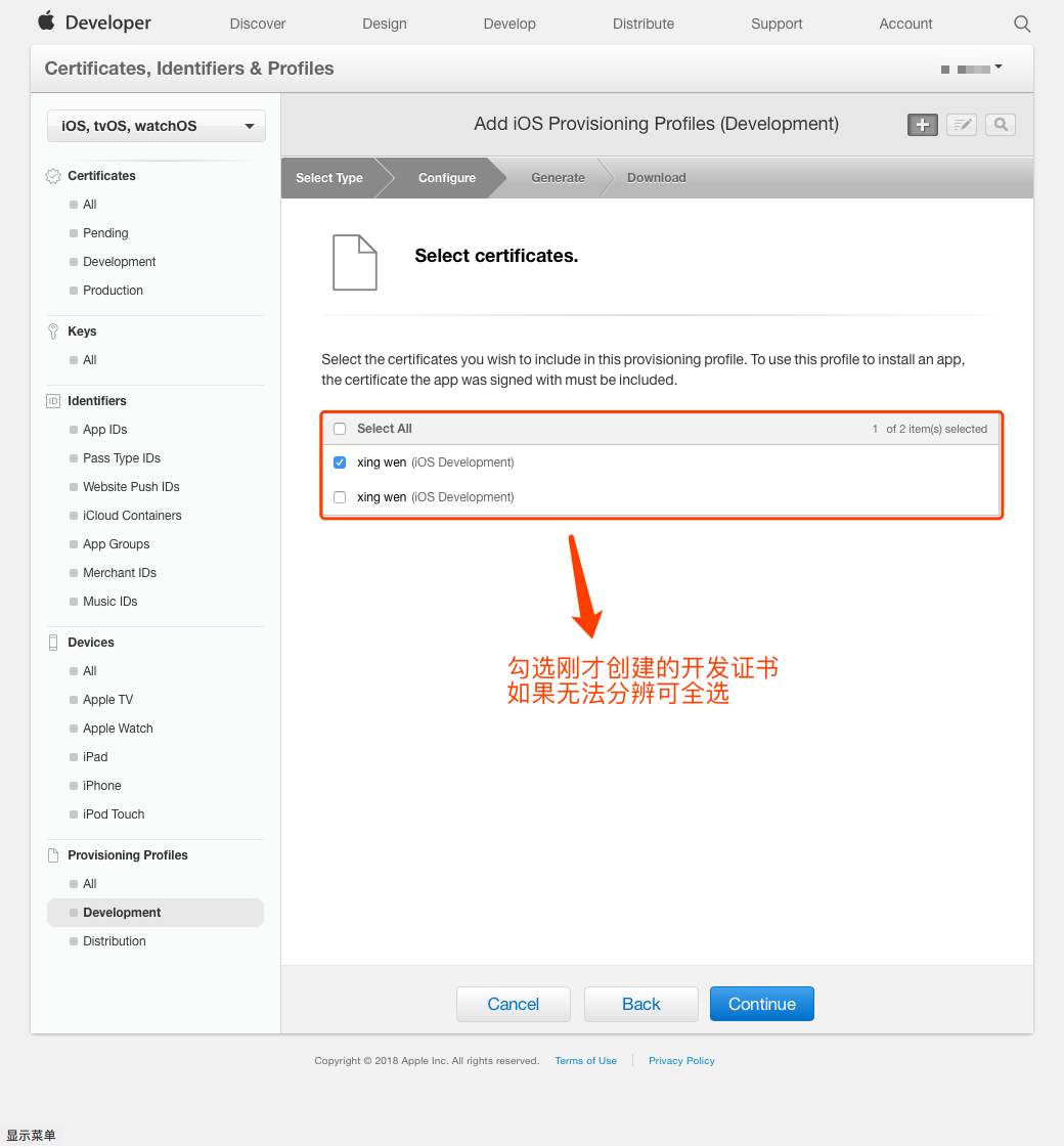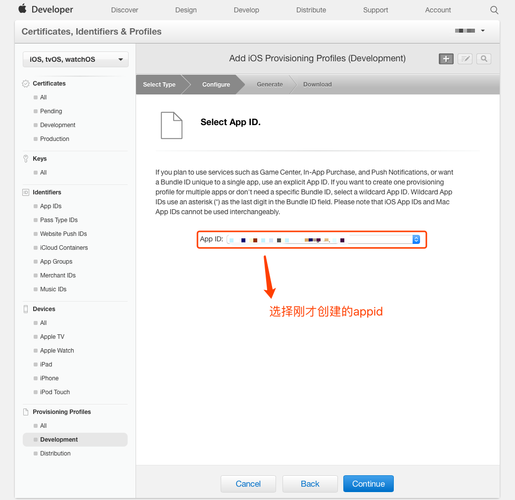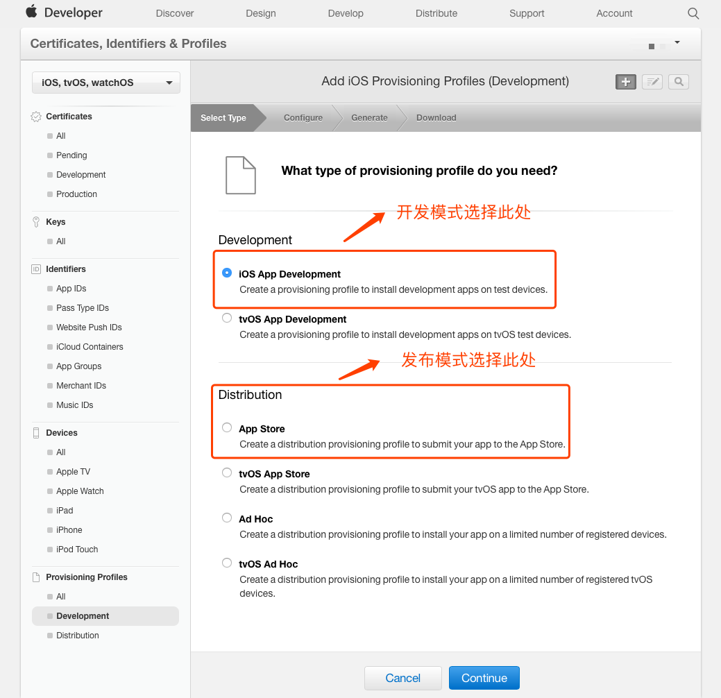 开发模式需要选择之前创建的App ID(为哪个APP创建描述文件)、添加过得UDID(哪些手机可以运行APP)、以及开发证书(使用哪个证书来开发或者打包)。