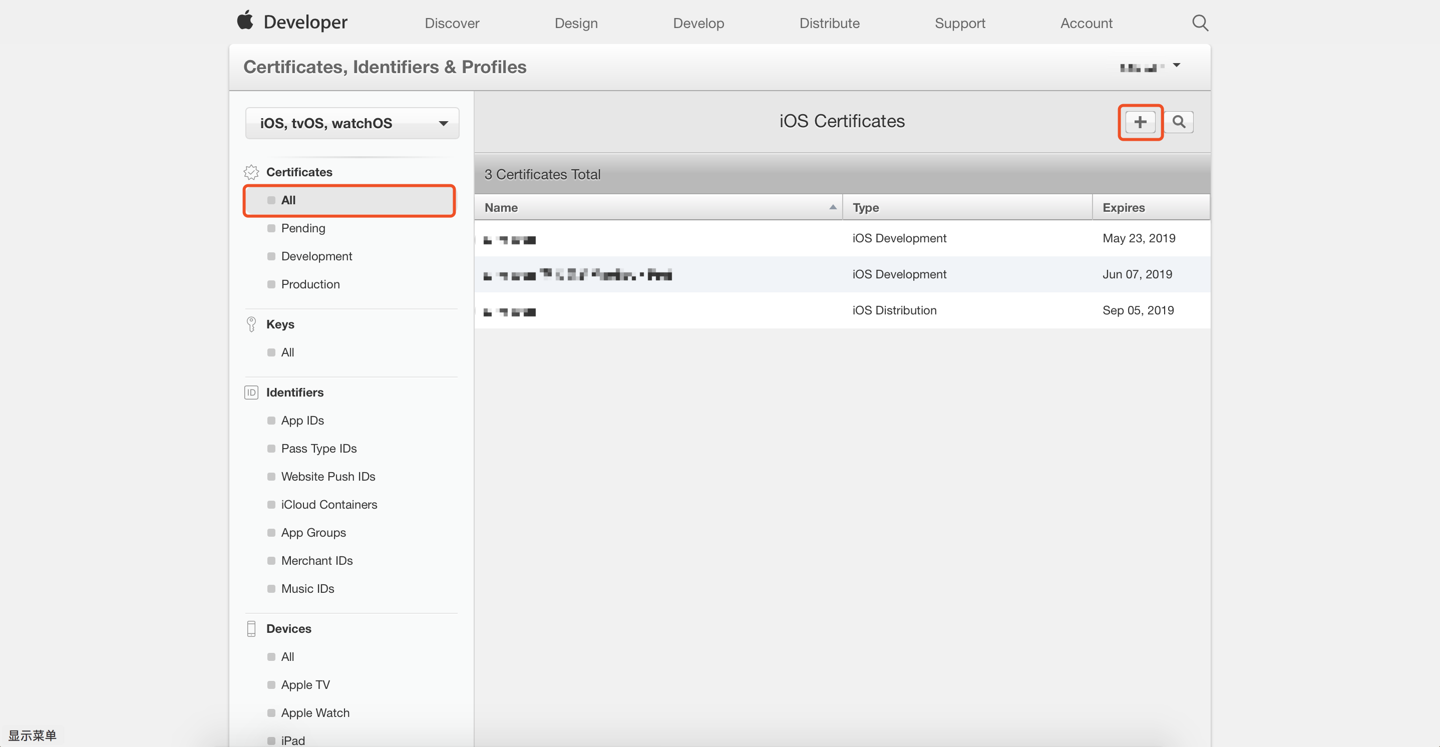 (1)首先登陆到开发者中心,点击Certificates,identifiers&Profiles图标,点进证书,会显示如下界面,点击右上角的加号