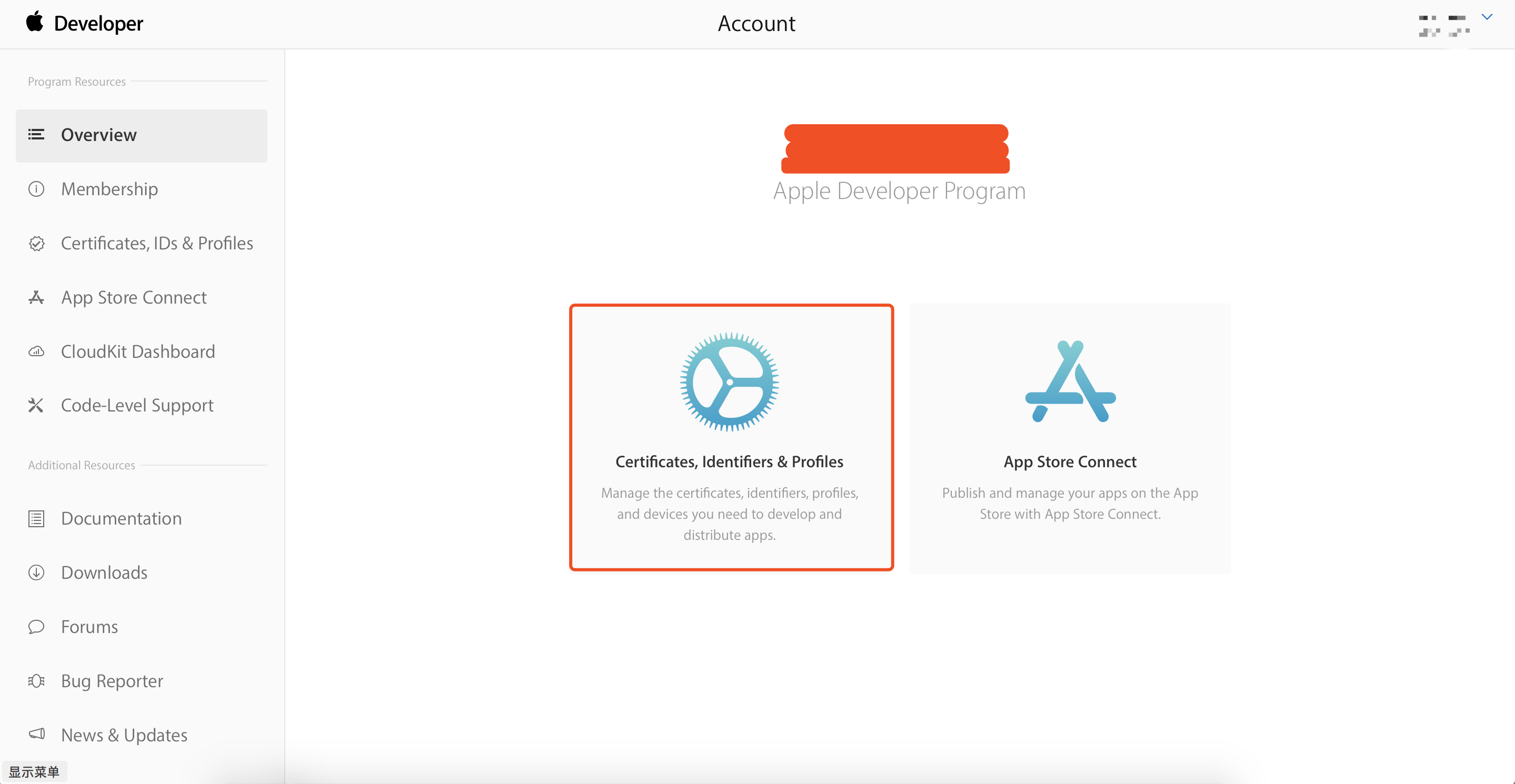 A:个人级:登录后的页面如下图:红色马赛克下方是:Apple Developer Program,再下方,只有Certificates,identifiers&Profiles和App Store Connect两个图标,第一个图标是开发者证书、App ID和描述文件生成的入口,第二个图标是将APP上传到App Store的入口。