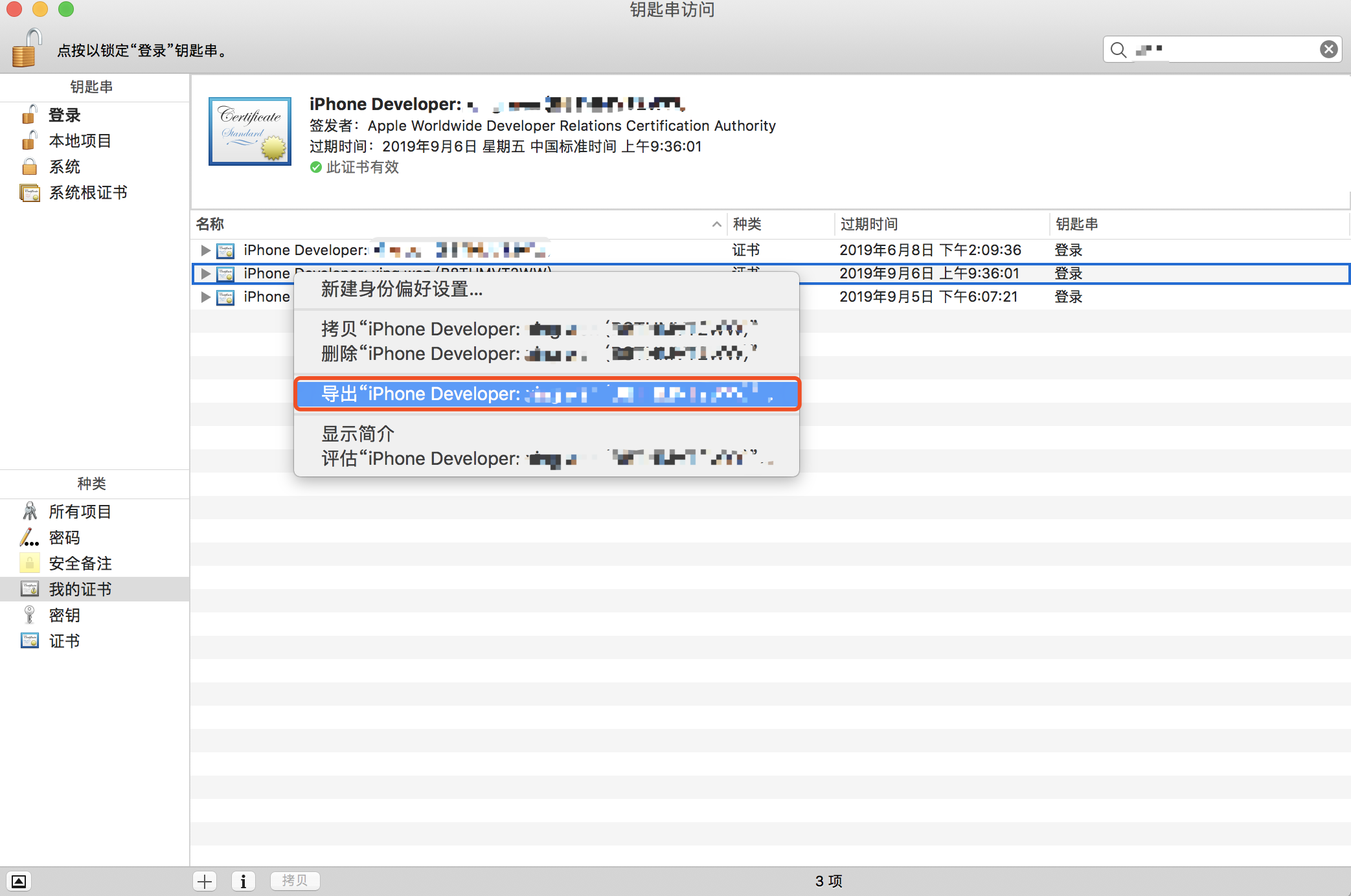 打开钥匙串,选择我们需要的证书,右击,选择“导出“iPhone Distribition:```”: