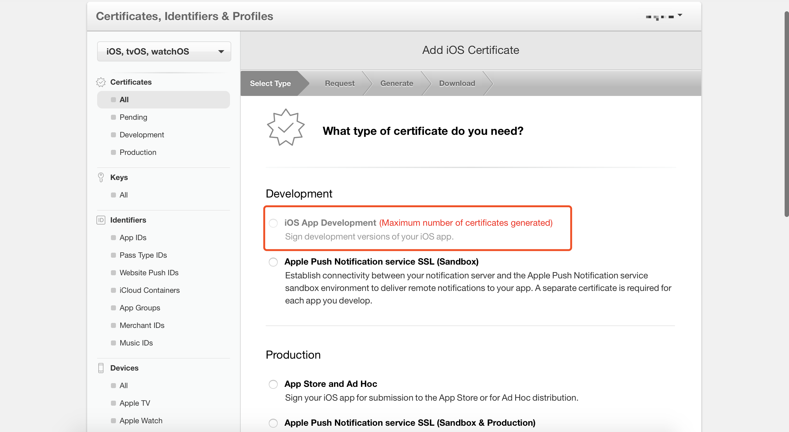当我们用大于三个mac设备开发应用时,想要申请新的证书,如果在我们的证书里,包含了3个发布证书,2个开发证书,可以发现再也申请不了开发证书和发布证书了(一般在我们的证书界面中应该只有一个开发证书,一个发布证书,没必要生成那么多的证书,证书一般在过期之后才会重新添加。)